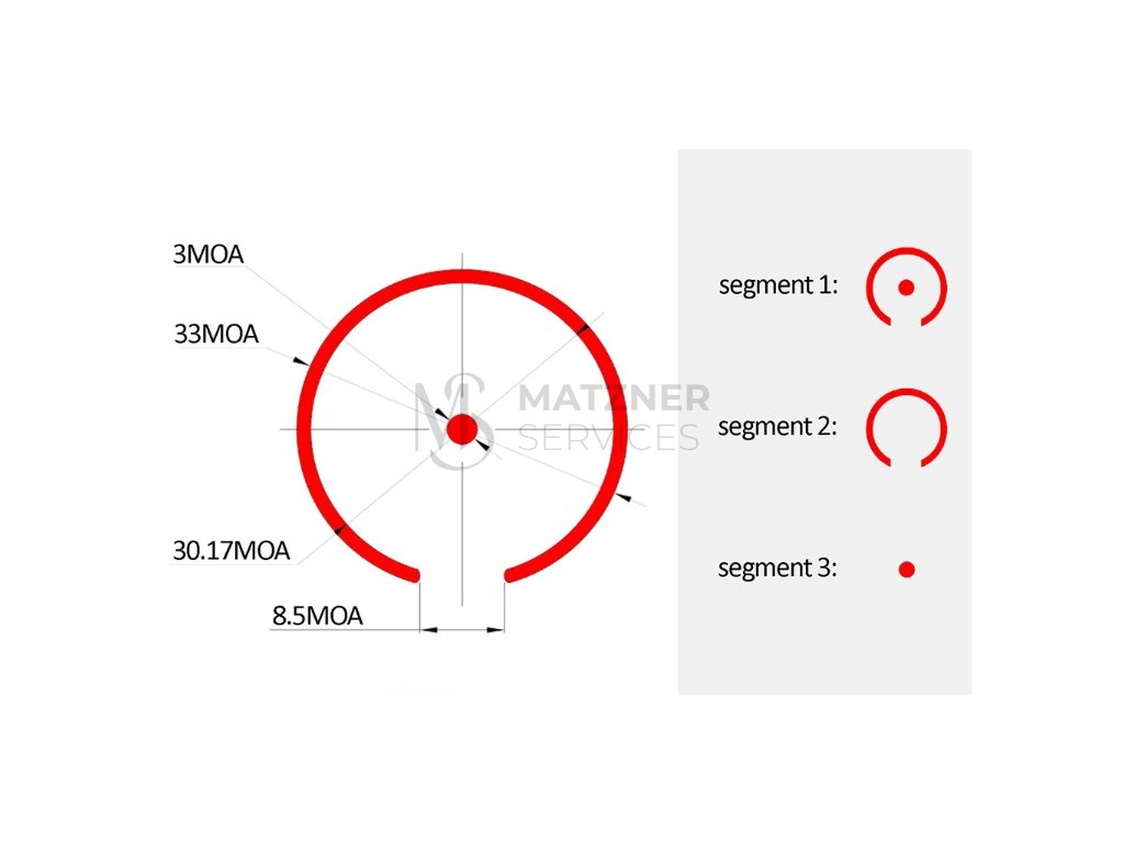- 3 záměrné osnovy v červené barvě (bod 3 MOA, kruh 33 MOA a kruh 33 MOA s bodem 3 MOA)