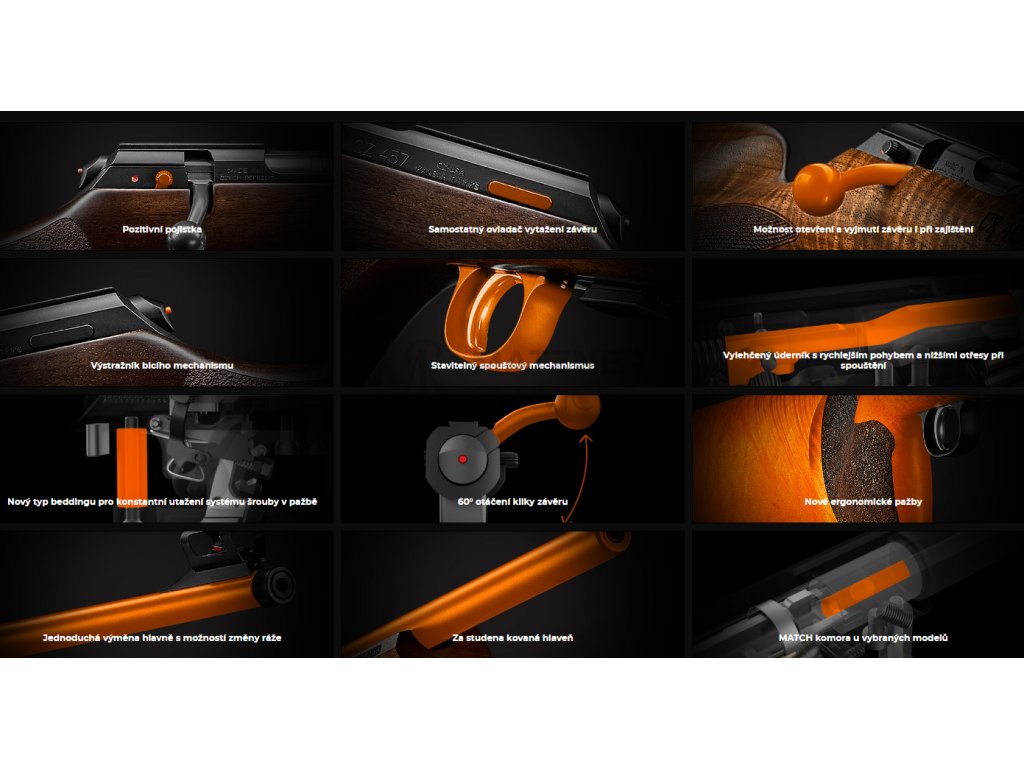 - MATCH komora u vybraných modelů - vybrané modely ráže .22 LR disponují MATCH nábojovou komorou na samé hranici tolerance norem CIP. Velmi precizní výroba a nízké tolerance nabízí skvělou garancí přesnosti 1 MOA v závislosti na použitém střelivu